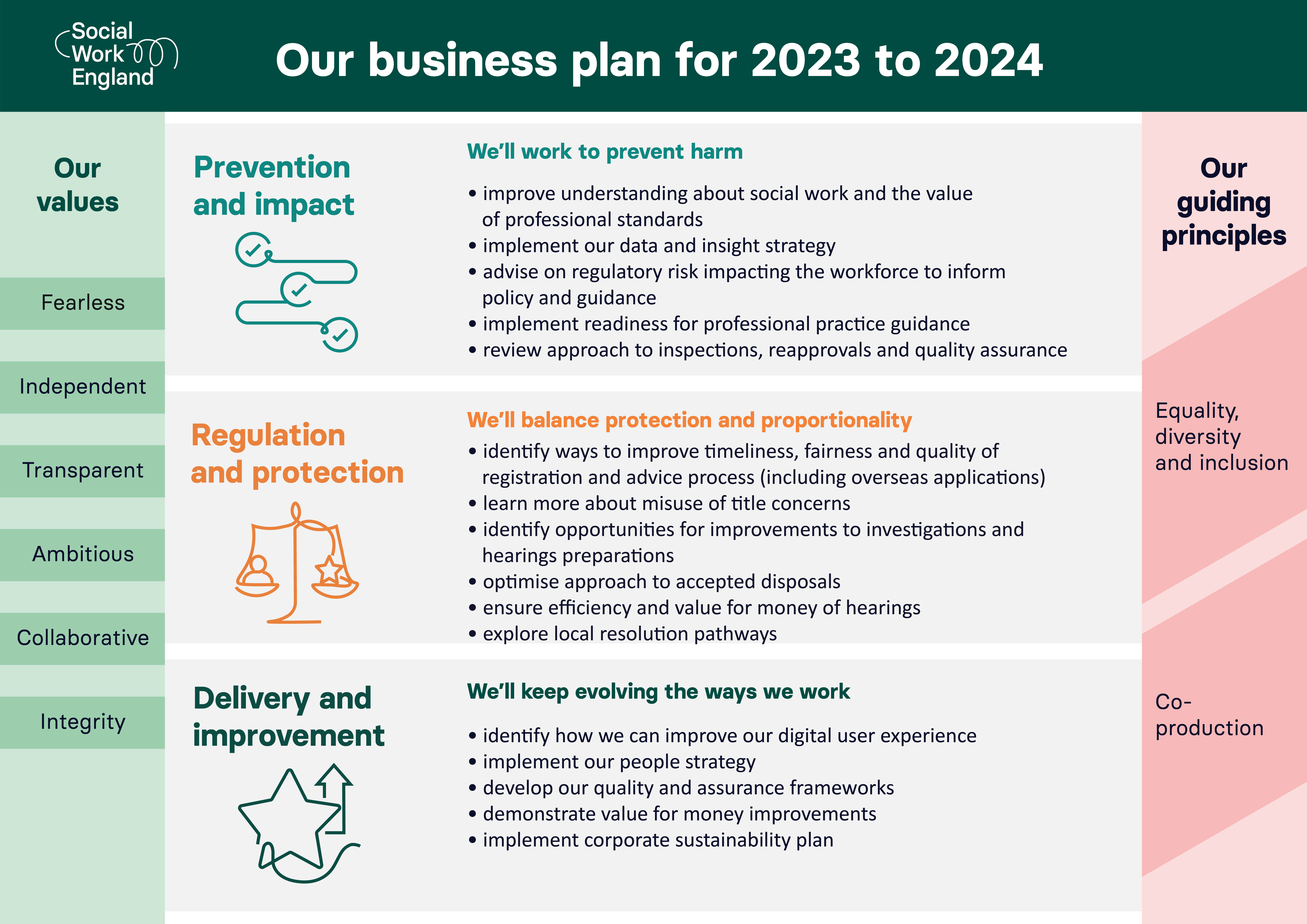 Maintaining efficiency and effectiveness in these functions will be the foundation of our work to deliver further improvements over the next three years. We will harness the increasing range of data and insight we hold to develop our evidence base and demonstrate our progress towards realising the benefits of being a specialist social work regulator.