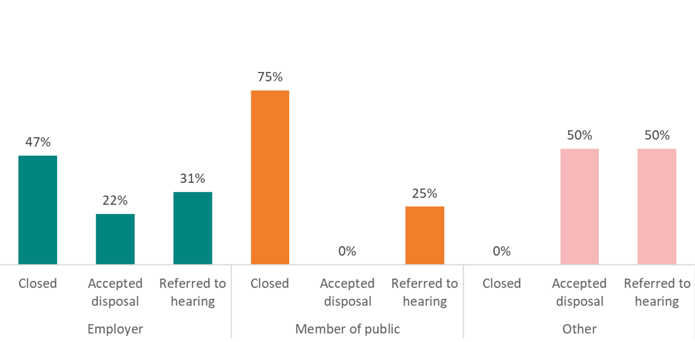 Case examiner outcomes for the different sources of referral