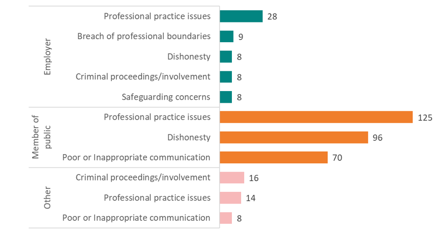 The themes listed below are overarching categories that include different reasons for making a fitness to practise referral. For further details please see the section on 'the top themes for the different sources of referral'.